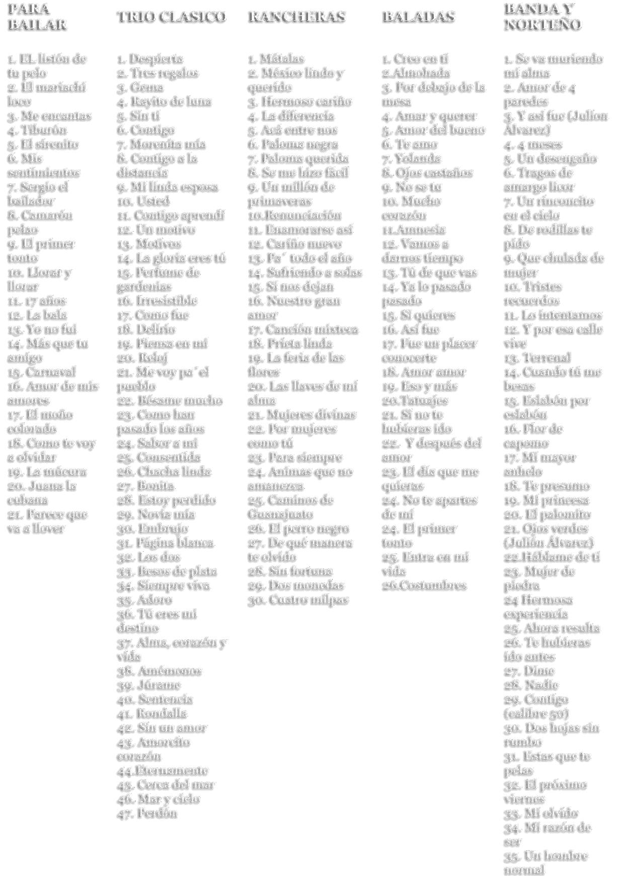 Este puede ser de tipo mariachi, incluyendo acordeón, vihuela, guitarra, guitarrón y trompeta, o si usted lo prefiere, puede ser del tipo tradicional, incluyendo guitarras, requinto, bajo y acordeón.